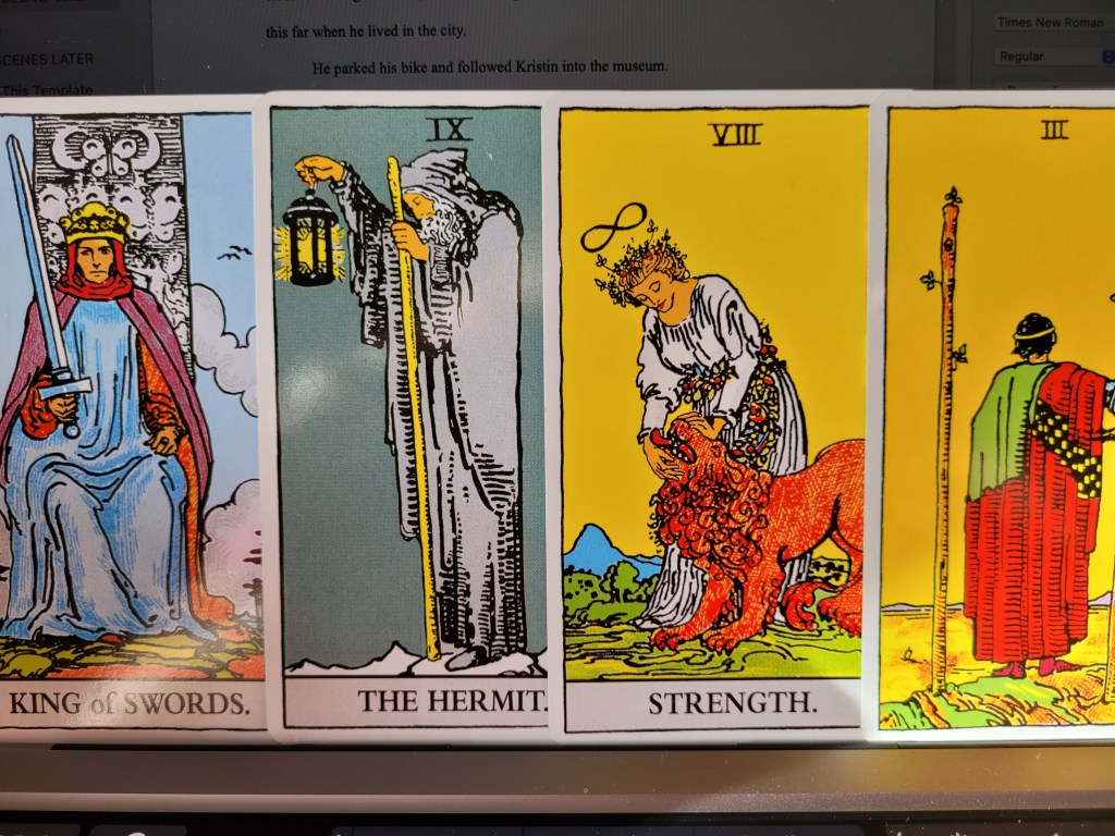 Note from author: This story was written after our writer’s group each pulled four cards from a Tarot deck. Do I ‘believe’ in Tarot? I’m science-minded. So, no I don’t ‘believe.’ But they tap into a brain hack that allows you to organize random facts into a story which is how writers try to understand the world. Each deck has great characters and topics and classic plots. Thanks to math, each deck has almost an infinite number of combinations. Can a Tarot deck divine your future? That’s for you to decide. But Tarot can help you divine a story.